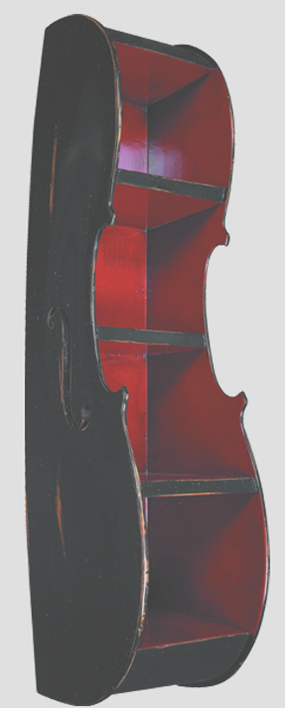 Cello Rack - Black Useful shelf storage with a whimsical musical reference to the classic lines and elegant details of the cello. Giving the illusion of a cello half-buried in the wall, the hanging rack looks great alone or arranged in a complete "string section" along the wall. Each rack will hold up to 52 classic CDs. Beautifully distressed black finish exterior with ruby red shelves. Built by skilled instrument makers who take their inspiration from such famous makers as Stradivari and Guameri. A delightful gift for a music lover or anyone who appreciates form following fancy. Height: 31.25" Width: 9" Depth: 7" Shipping Weight: 24 lbs. ITEM: AM-MC152B PRICE: $198.00 DISCONTINUED