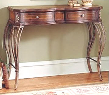 Hand Tooled Leather Console Table Graceful console table with two working drawers. Hand tooled leather on top, sides and drawer fronts. Cast aluminum legs with rustic finish. Bordeaux Leather Finish Height: 32" Width: 40" Depth: 12" Weight: 70 lbs. ITEM: BC-0656073 DISCONTINUED |