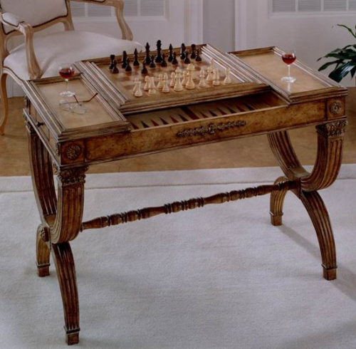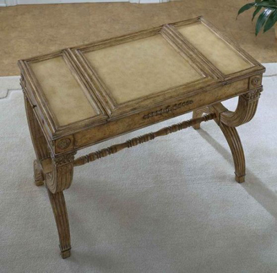 Leather Top Game Table Game table with hand tooled leather top surface and hand carved details. Clever design features a reversible slide out center panel with leather chess board on one side and smooth leather on the other. Leather backgammon board is stored in well. Includes all game pieces for chess, checkers, backgammon and cribbage. Made of select solid woods, choice veneers and resin components. Heritage Finish Height: 29½" Width: 41¾" Depth: 22¾" Weight: 94 lbs. ITEM: BC-0598070 DISCONTINUED  |