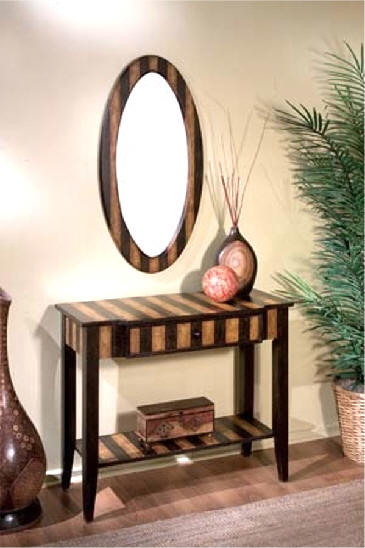Parisian Striped Console Table Elegant console table with felt lined drawer and lower display shelf. Delightful striped design is hand painted by skilled artisans. Made of select solid woods and wood products. Parisian Striped hand painted finish. Matching mirror also available below: Height: 30" Width: 36" Depth: 16" Weight: 55 lbs. ITEM: BC-0651046 DISCONTINUED  Hand Painted Parisian Striped Oval Mirror Height: 38" Width: 19½" Weight: 14 lbs. ITEM: BC-0167046 DISCONTINUED |